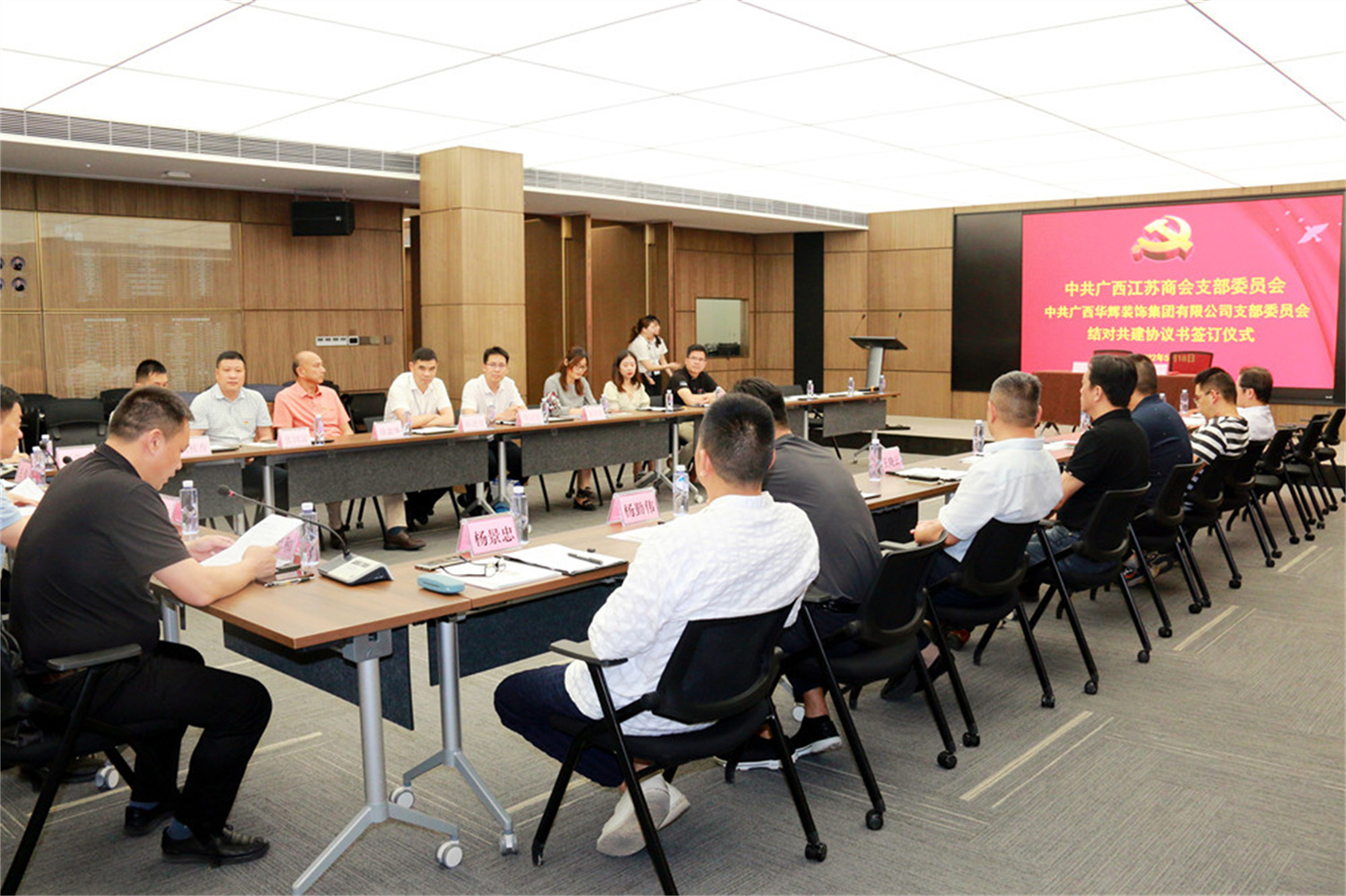 签约仪式上,商会党支部书记王伟、leyu装饰集团党支部书记刘萍东签订了结对共建协议,并由王伟同志代表广西江苏商会党支部向广西leyu装饰集团有限公司党支部赠牌。