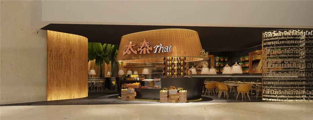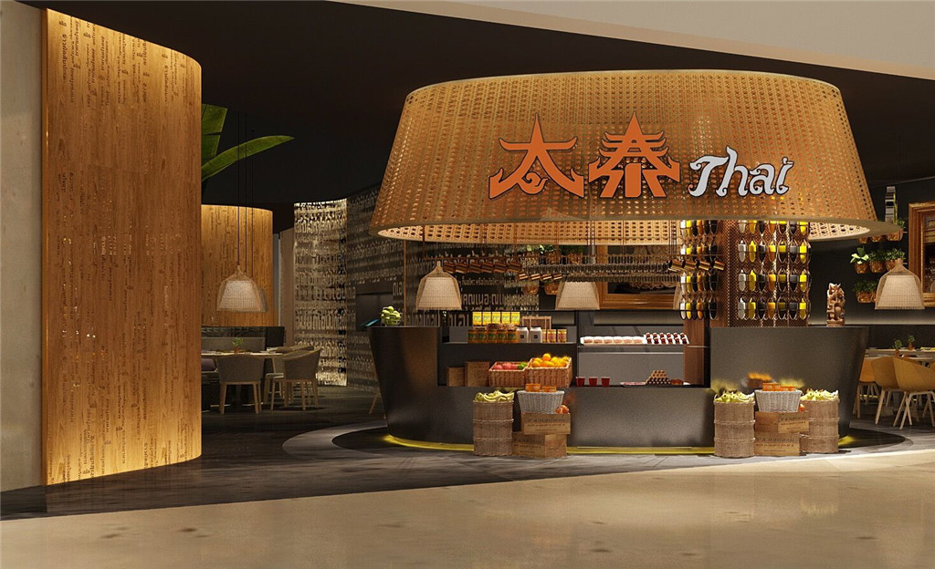 本项目融入大量的泰国元素:手工竹艺编织的收银台顶超大灯罩及小吊灯灯罩、木艺雕刻、芭蕉树、装饰画、绿植等,演绎原汁原味的泰国风情。色泽上大多采用原木色调及泥土褐色,散发着浓烈的自然气息,搭配明艳的黄色,自然温馨中不失欢跃之感。自然、热情、独特,这是大景倾情打造的地道真实的泰国味道。